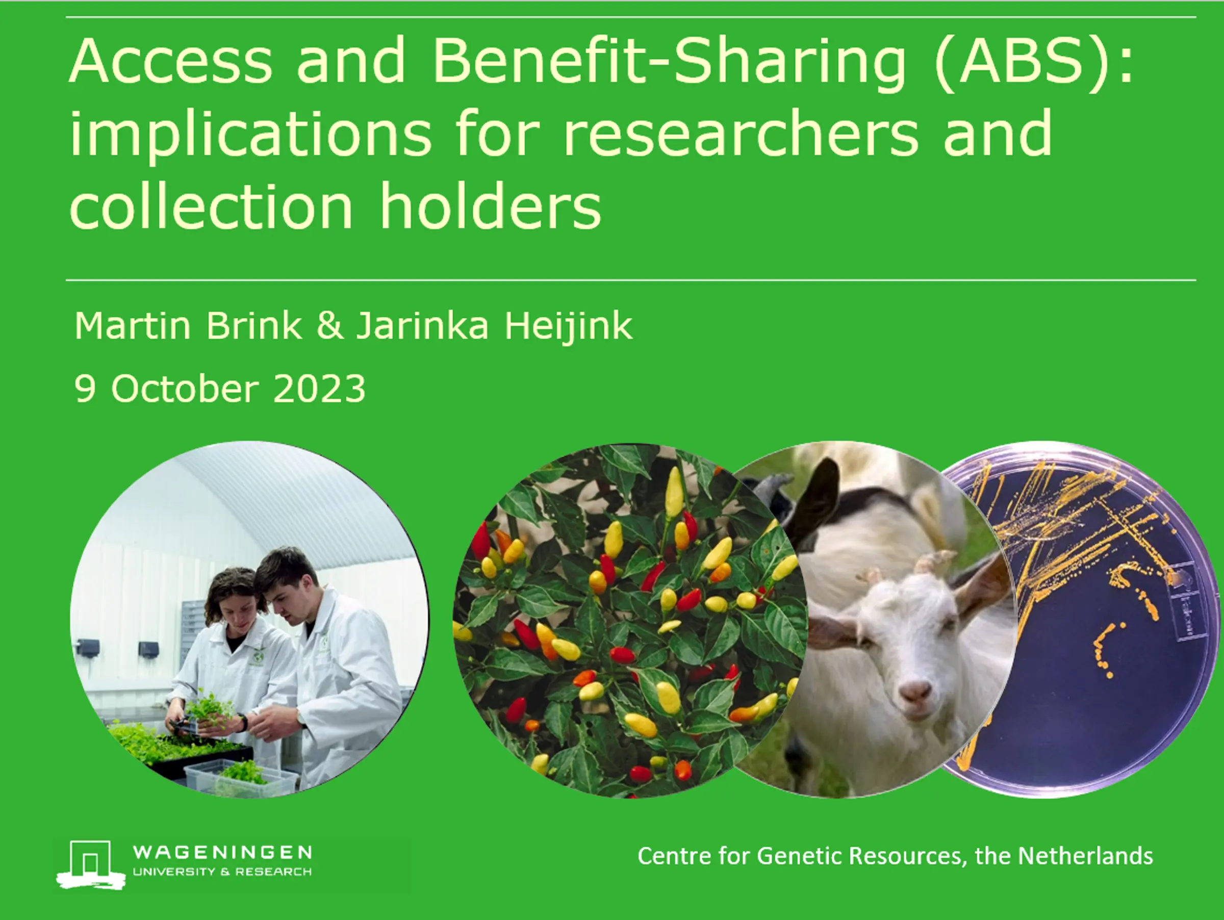 Presentatie ' 'Access and Benefit-Sharing (ABS): implications for researchers and collection holders' door Martin Brink en Jarinka Heijink (ABS Focal Point), gehouden op 9 oktober 2023.