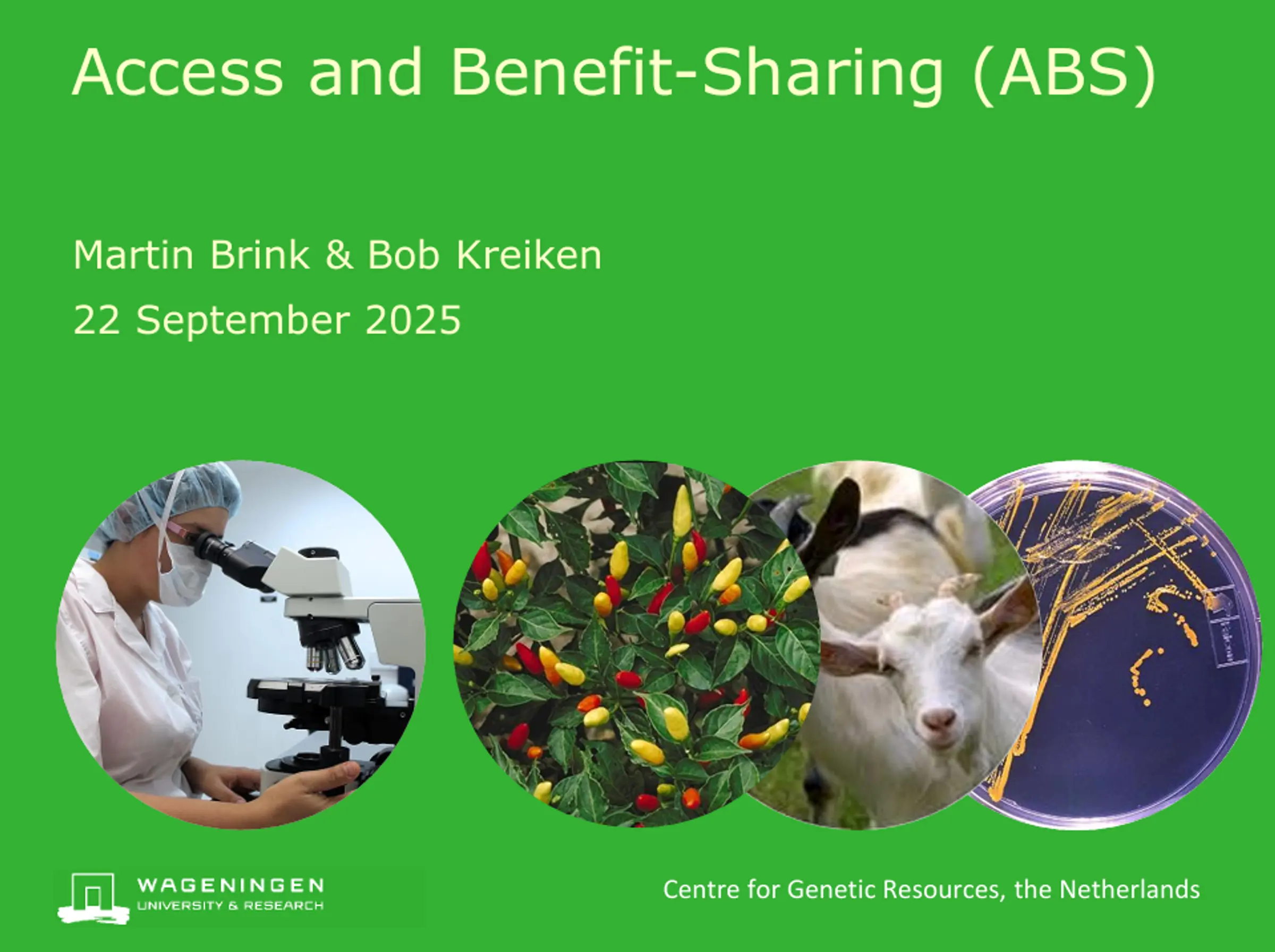 EN presentations2025-09-21T22:00:00.000ZPresentatie aan bezoekers van de genenbank over ABSPresentatie 'Access and benefit-sharing', gehouden op 22 september 2025.DownloadPresentation to genebank visitors